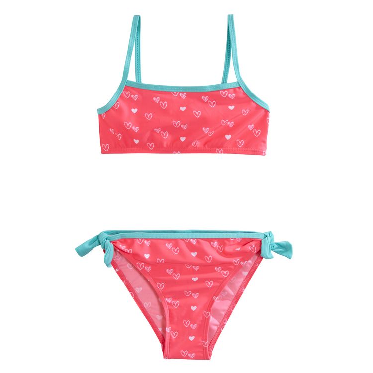 Les filles craquent pour l'imprimé "coeurs", très girly, de ce bikini ! Agréable à porter. Coupe pensée pour bouger en toute liberté. Haut forme bandeau, fines bretelles. Slip de bain assorti, noeuds fantaisie placés sur les côtés, le fond est doublé pour le confort. Ce maillot de bain 2 pièces