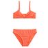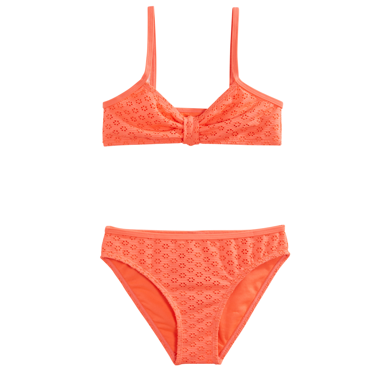 Les filles adoptent illico ce bikini coloré au charmant effet dentelle ! Agréable à porter. Coupe pensée pour bouger en toute liberté. On aime le dessus à l'effet dentelle. Haut forme bandeau, resserré à l'entrebonnet, fines bretelles. Slip de bain assorti, taille élastiquée, le fond est doublé