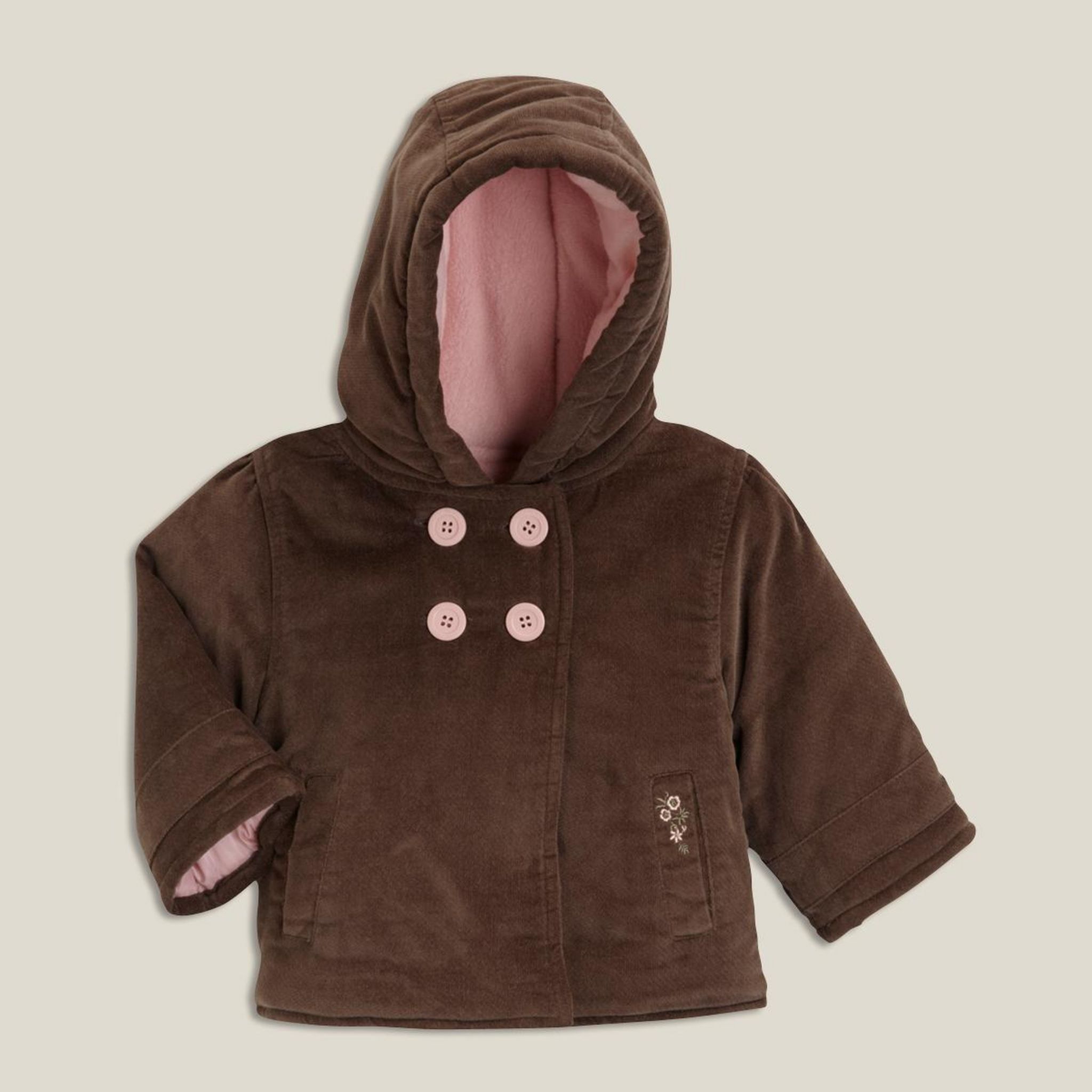 Petit look chic pour bébé avec ce manteau en velours ! Agréable à porter et bien chaud. Entièrement ouatiné. Dessus 100% coton. Doublure corps et capuche en polaire. Ouverture double boutonnage sur le haut. 2 poches. Petites fronces sur les épaules. Discrètes fleurs brodées. Ce manteau bébé fille es