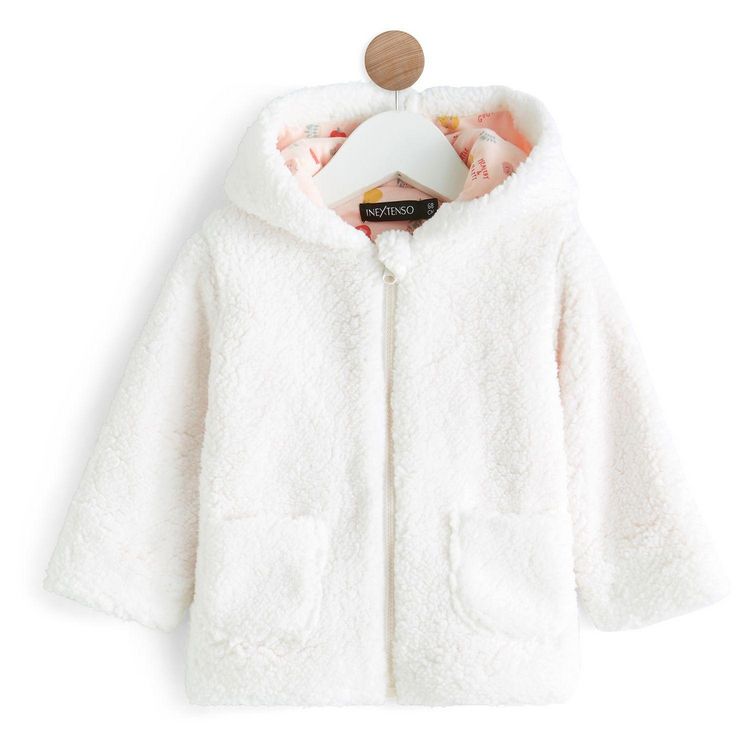 Un manteau en fausse fourrure effet sherpa hyper confort et chaud pour la saison hivernale qui ravira bébé fille ! On aime les poches plaquées devant, les petites oreilles sur la capuche et la doublure en jersey à motif fruité fantaisie. Ce manteau dispose d'une ouverture par zip devant. Il est facile d'entretien.