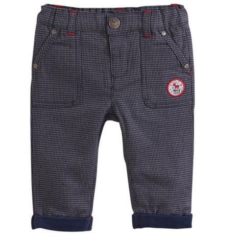 Ce pantalon à motifs offre un look décontracté à bébé : on est fan ! 100% coton. Entièrement doublé. Toucher doux. Pratique : ceinture ouverte par une pression et ajustable de l'intérieur par un élastique boutonné. Surpiqûres et rivets fantaisie. 2 poches. Bas de jambe retroussés. Badge cousu.