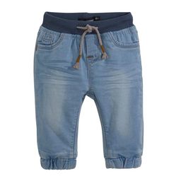Allure décontractée pour bébé avec ce pantalon en jean. Denim agréable à porter, aspect délavé par endroit. Taille élastiquée en bords-côtes, avec cordon de resserrage. Fausses poches devant, 2 poches au dos. Bas de jambe élastiqués. Jeu de surpiqûres. Ce jean bébé garçon est lavable en mach