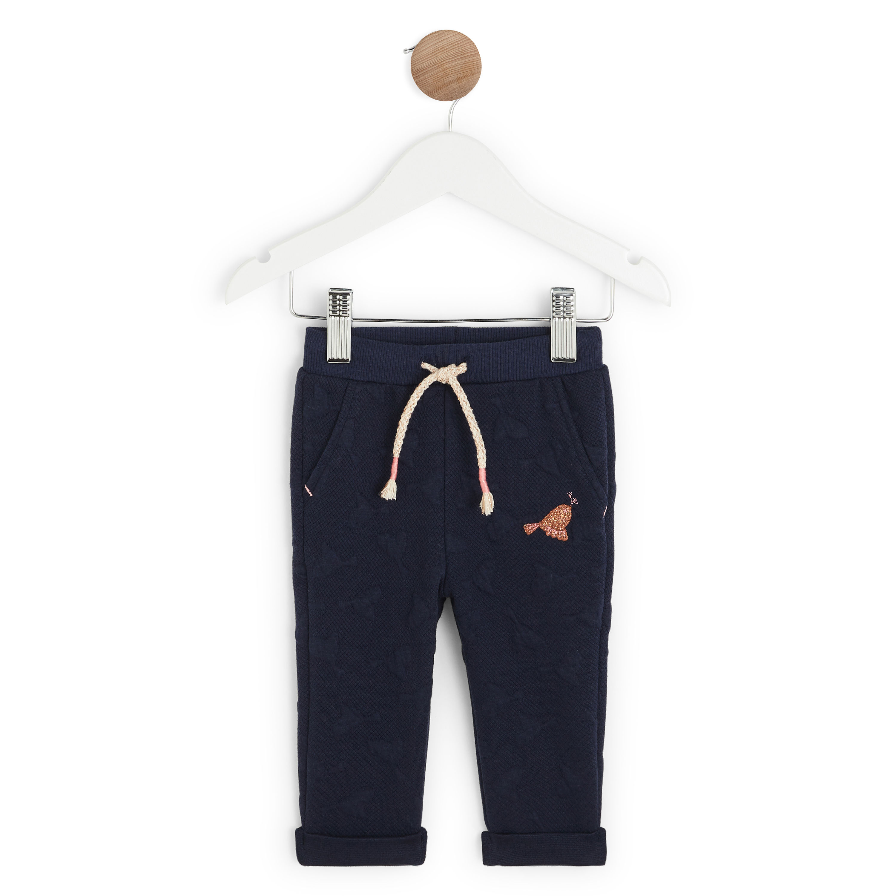 Super confortable, ce pantalon en molleton fantaisie est parfait pour les petits curieux et actifs ! La taille élastiquée maintien mais ne serre pas, et les jambes possèdent un revers cousu très douillet. On aime le joli lien de serrage contrastant à la ceinture et le motif oiseau pailleté placé su