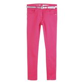 Un pantalon skinny à pois, ça change de l'uni et c'est complètement tendance ! Denim confortable. Taille ajustable de l'intérieur par élastique et boutons. Ouverture par bouton métal et zip. 5 poches. Jeu de surpiqûres. Ceinture argentée, aspect brillant, avec boucle en métal. Ce pantalon fille e