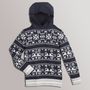 On craque pour ce pull garçon à capuche revisité. Agréable à porter. Maille chaude. Capuche unie. Finition bords-côtes. Ce pull jacquard garçon est lavable en machine à 40°.
