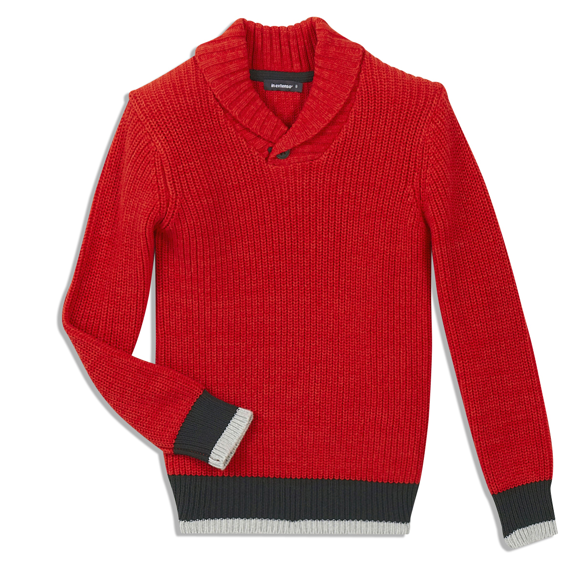 Un pull garçon haut en couleur : c'est parfait pour la saison froide ! Grosse maille, 100% coton. Col châle avec un bouton. Manches longues. Bords rayés. Ce pull enfant est lavable en machine à 40°.