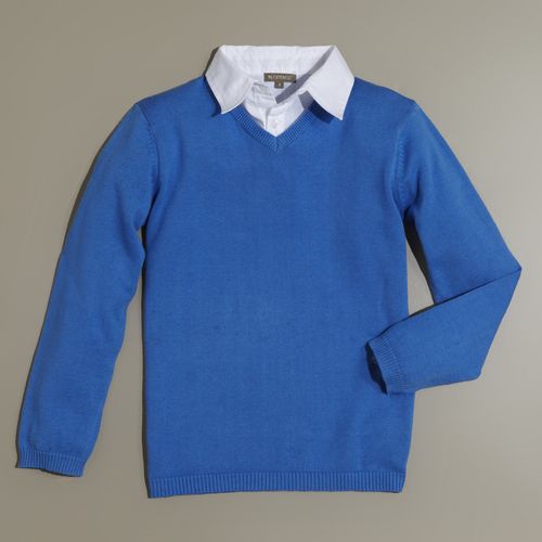 Bel effet 2 en 1 pour ce pull garçon rehaussé d'un col chemise ! Col chemise avec ouverture boutonnée. Pull garçon réalisé en tricot pur coton, agréable à porter. Col V, manches longues. Finition bords-côtes. Ce pull élégant garçon est lavable en machine à 40°.