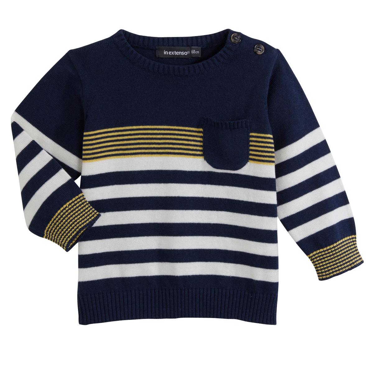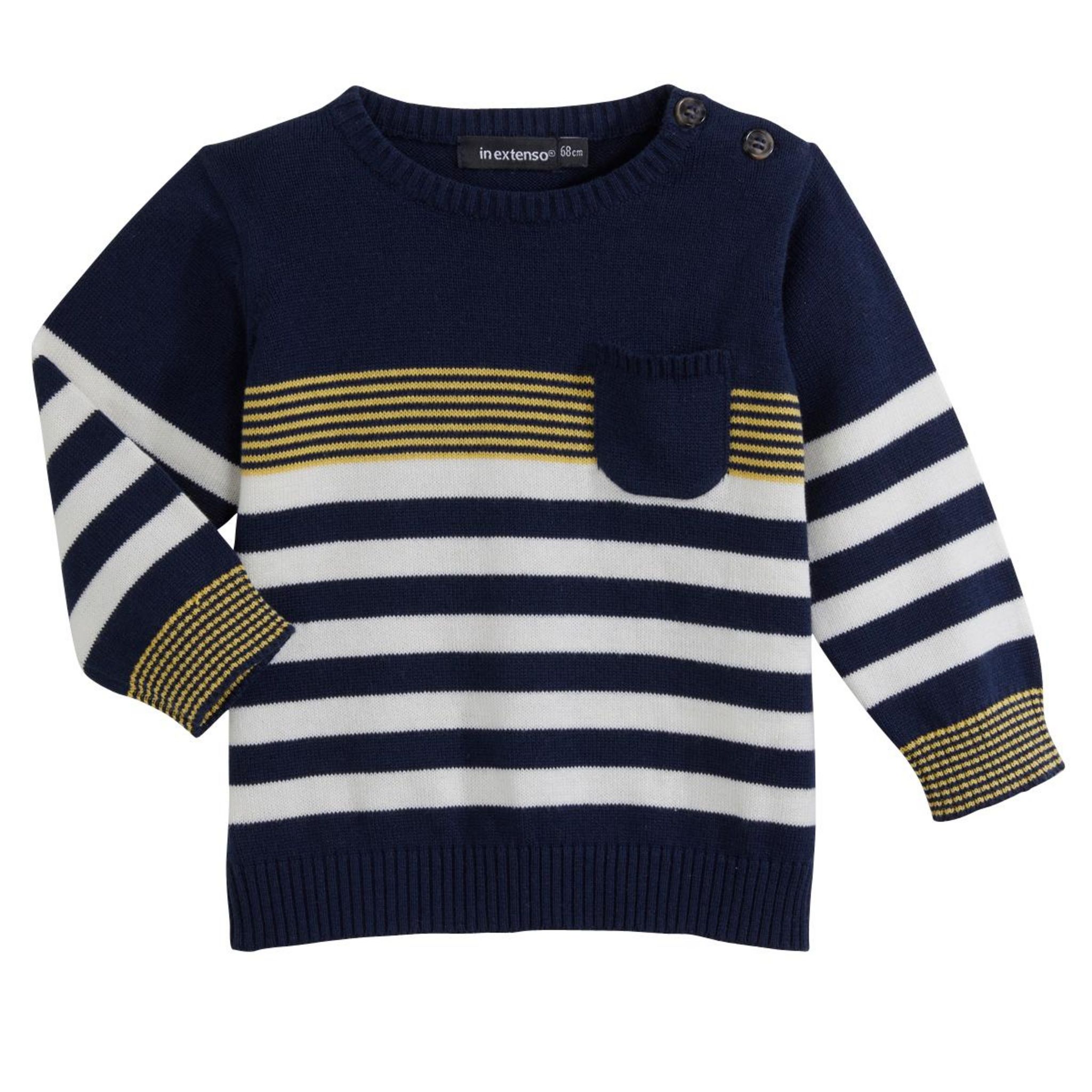 En savoir +Ce pull bébé garçon s'anime d'un jeu de rayures pour séduire les mamans. Il est réalisé en tricot. Le pull bébé dispose d'un col rond, d'une ouverture boutonnée sur l'épaule et de manches longues. On note la poche placée sur la poitrine et les bords-côtes.