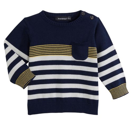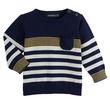 Ce pull bébé garçon s'anime d'un jeu de rayures pour séduire les mamans. Il est réalisé en tricot. Le pull bébé dispose d'un col rond, d'une ouverture boutonnée sur l'épaule et de manches longues. On note la poche placée sur la poitrine et les bords-côtes.