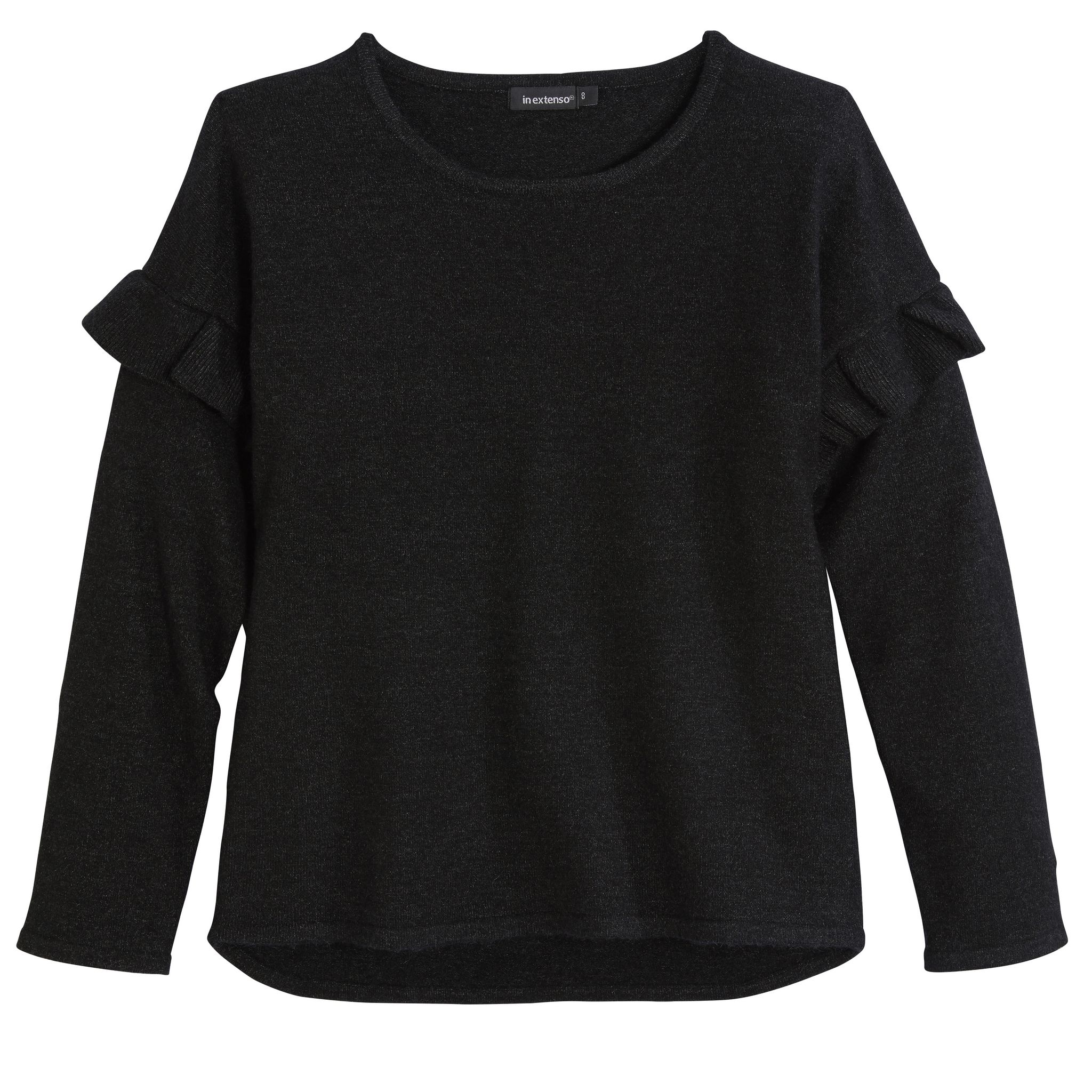Ce pull fille est parfait pour la saison froide : il est chaud et craquant. On aime sa maille fine et les volants fantaisie sur les manches. Le pull fille possède un col rond et des manches longues. Il est facile d'entretien.