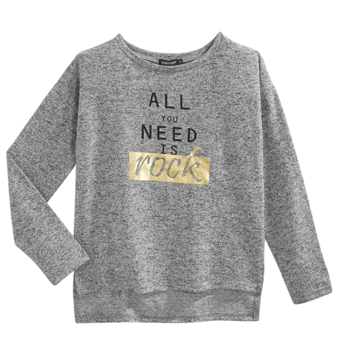 Ambiance rock'n'roll au rendez-vous avec ce pull en maille fine pour fille ! Maille chinée, douce et agréable à porter. Imprimé fantaisie, avec touches brillantes, sur le devant. Col rond, manches longues. Base plus longue au dos, fendue de chaque côté. Ce pull chiné pour fille est lavable en m
