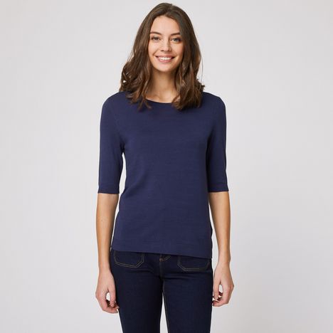 Ce pull uni à manches 3/4 est le bon basique à avoir dans son dressing. Il s'associe aussi bien avec un jean qu'un pantalon chino.