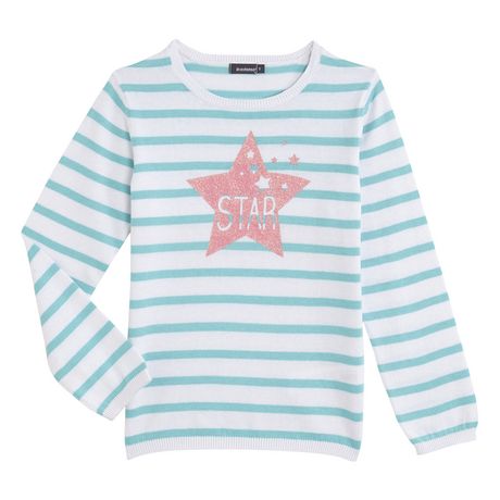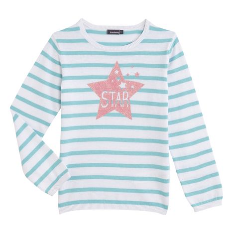On revisite le pull marinière avec des décors à paillettes rien que pour les filles ! Pull rayé. Maille fine, toucher doux, agréable à porter. 100% coton. Col rond, manches longues. Finition bords-côtes. Lavable en machine à 40°.