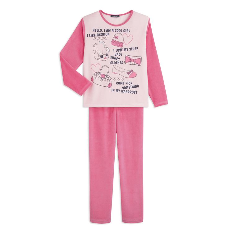 Un pyjama en velours 100% girly, ça plaît aux filles ! Confortable et doux. Haut : col rond, manches longues contrastées, grand imprimé sur le devant. Pantalon : uni, taille élastiquée. Ce pyjama fille est lavable en machine à 40°.