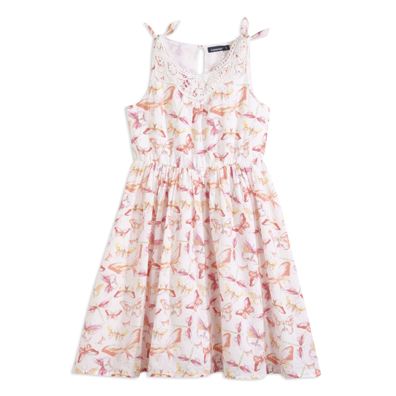 Faites entrer l'été dans la garde-robe des filles avec cette robe sans manches. Imprimé "papillons". Voile 100% coton, coupe évasée. Robe entièrement doublée pour le confort. Ouverture goutte en haut du dos pour l'enfiler facilement. Nœuds fantaisie sur les épaules. Jeu de plis. Jolie finition