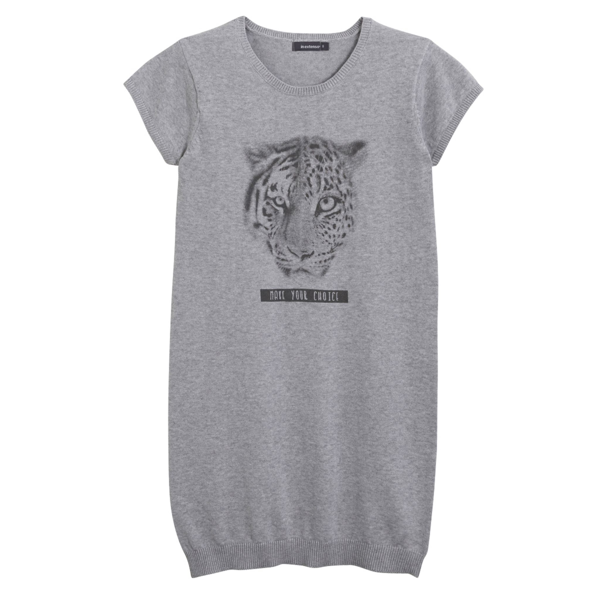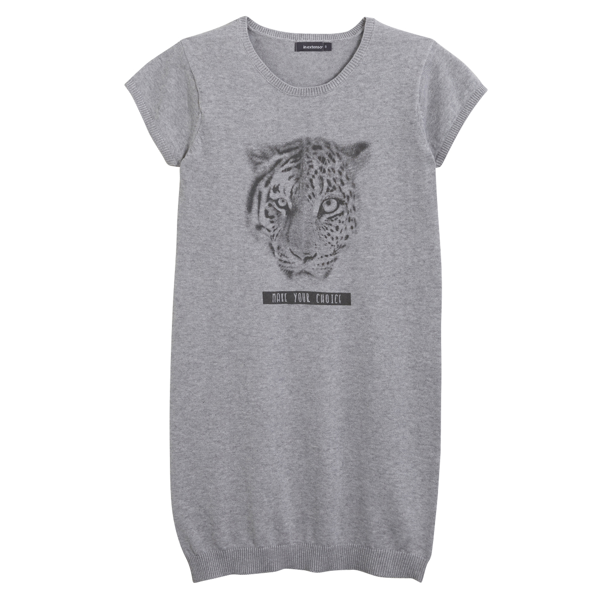 Douce et tendance, les filles porteront cette robe en maille durant toute la saison froide ! Maille fine agréable à porter. 100% coton. Imprimé fantaisie sur le devant. Col rond, manches courtes. Finition bords-côtes. Cette robe fille est lavable en machine à 40°.
