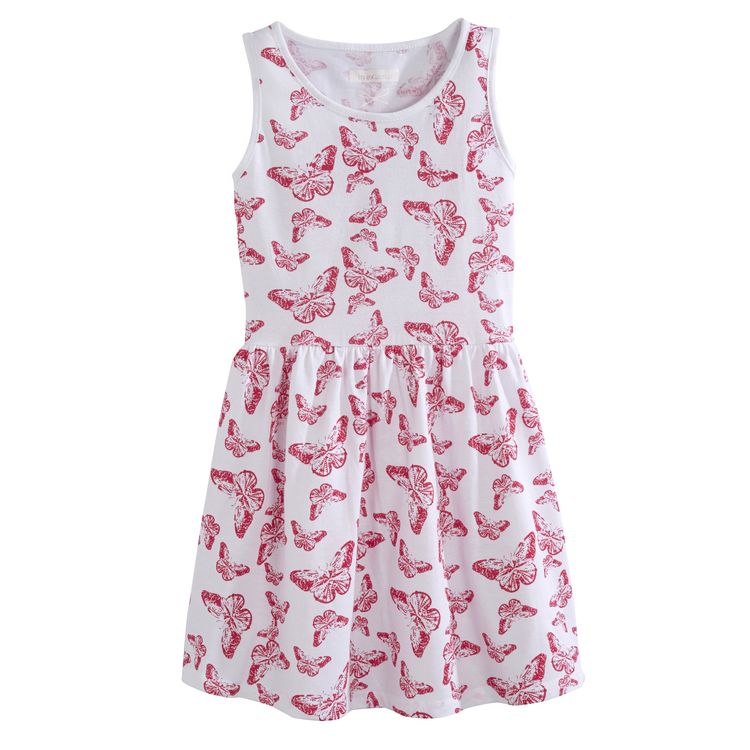 Les filles adoptent illico cette robe imprimée ! Robe sans manches fille. Légère et agréable à porter. 100% coton. Col rond. Base évasée, jeu de plis. Il n'y a pas d'étiquette dans le cou pour un supplément de confort. Lavable en machine à 40°.