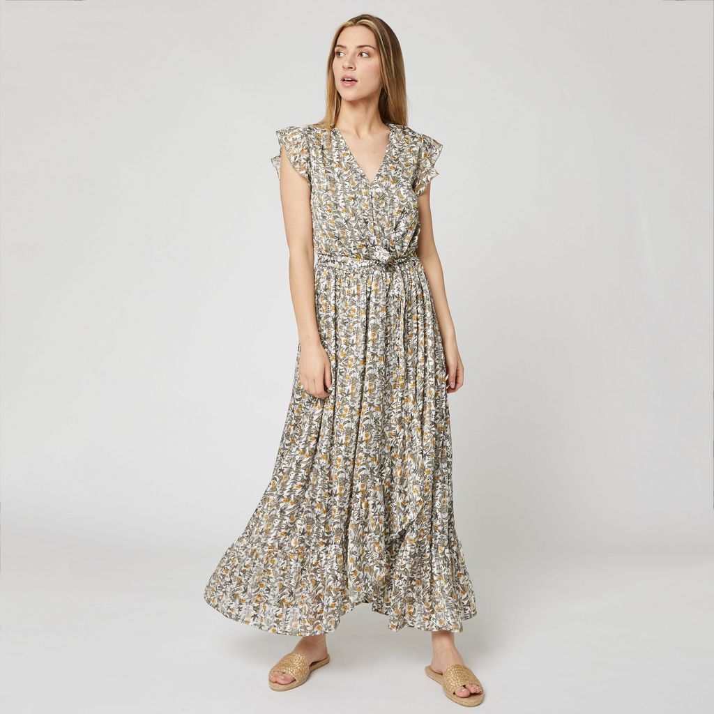 Les chaleurs estivales ne vous feront pas peur avec cette robe longue à volants. Elle possède un imprimé fleuri all over et une ceinture assortie. Sa matière est douce et agréable à porter.