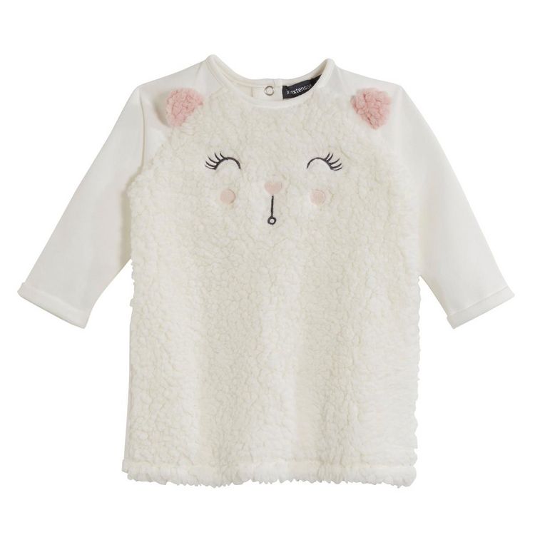 Les mamans craquent forcément devant cette robe bébé fille ! On aime : le devant recouvert de maille peluche effet mouton, ultra douce ; et les animations fantaisie et brodées. La robe bébé fille possède un col rond, des manches longues et une ouverture pressionnée en haut du dos.