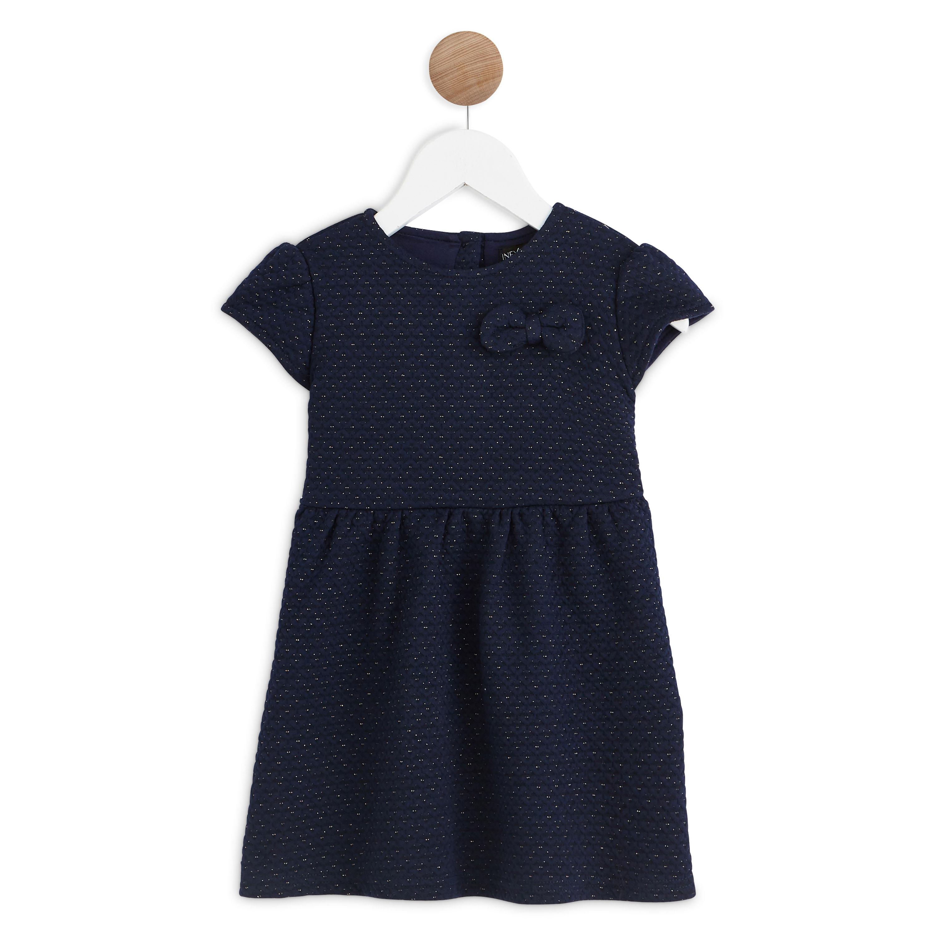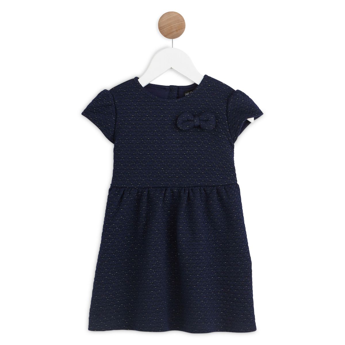 En savoir +Chic et élégante, cette robe à manches courtes en molleton s’invite dans le dressing de fête de nos petites princesses. Cette jolie pièce à col rond se pare d’un motif fantaisie ton sur ton rehaussé de fils Lurex pour apporter une note scintillante à la silhouette. Des petits plis soulignent la taille et un joli nœud assorti complète la tenue. Elle s’enfile facilement grâce à son boutonnage au dos.