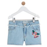 En savoir +Indispensable dans le dressing d’été des filles, le short en jean 5 poches se décline dans une version brodée avec haut de jambes effilochés dans un style tropical très estival !