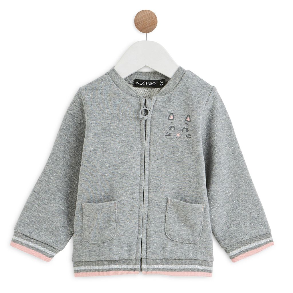 Qu’il est mignon, ce petit blouson style teddy en molleton ! Il accompagnera toutes les tenues de bébé fille. Il possède un col base-ball, une finition bord-côte rayée, une fermeture entièrement zippée et deux poches plaquées devant. On aime le motif chat hyper craquant imprimé sur la poitrine