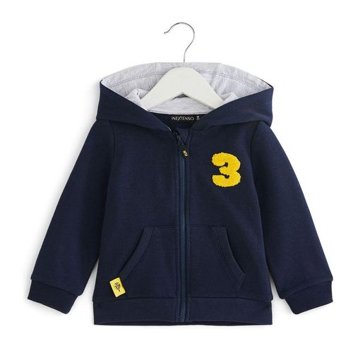 On craque pour ce joli gilet en molleton douillet ! Très confortable à porter, ce gilet zippé possède une capuche doublée de jersey et un chiffre jaune vif en bouclette appliqué sur le devant. Bébé va adorer glisser ses petites mains bien au chaud dans les poches kangourous.