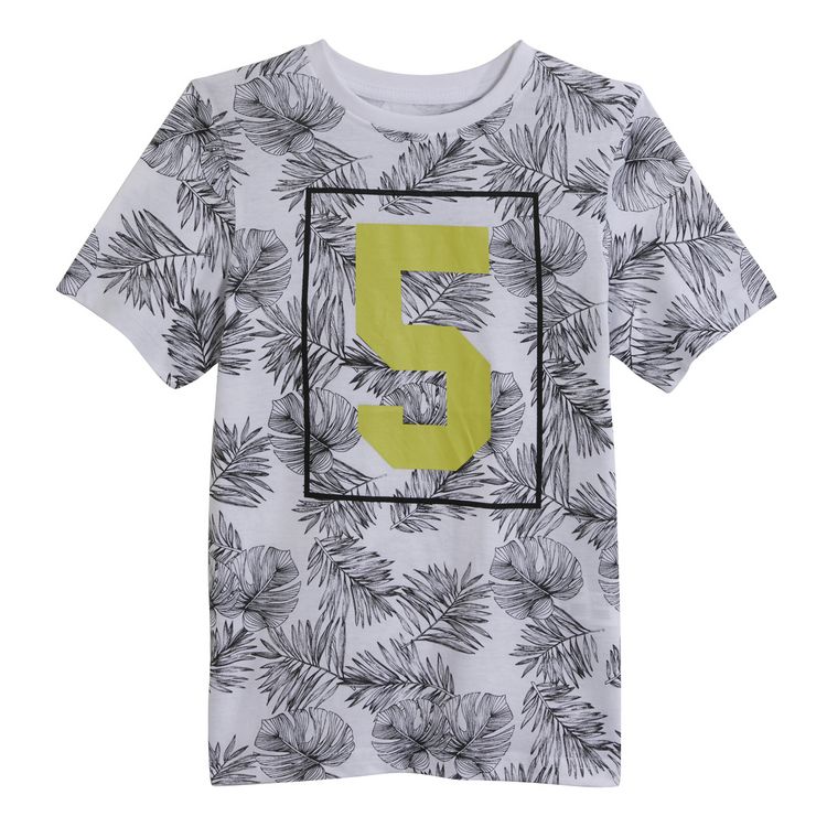 Original et tendance, ce tee-shirt garçon à manches courtes aura du succès cet été ! On aime : l'imprimé "feuilles tropicales". Il est réalisé en coton, doux et confortable. Le t-shirt garçon possède un col rond et des manches courtes. Il est facile d'entretien.