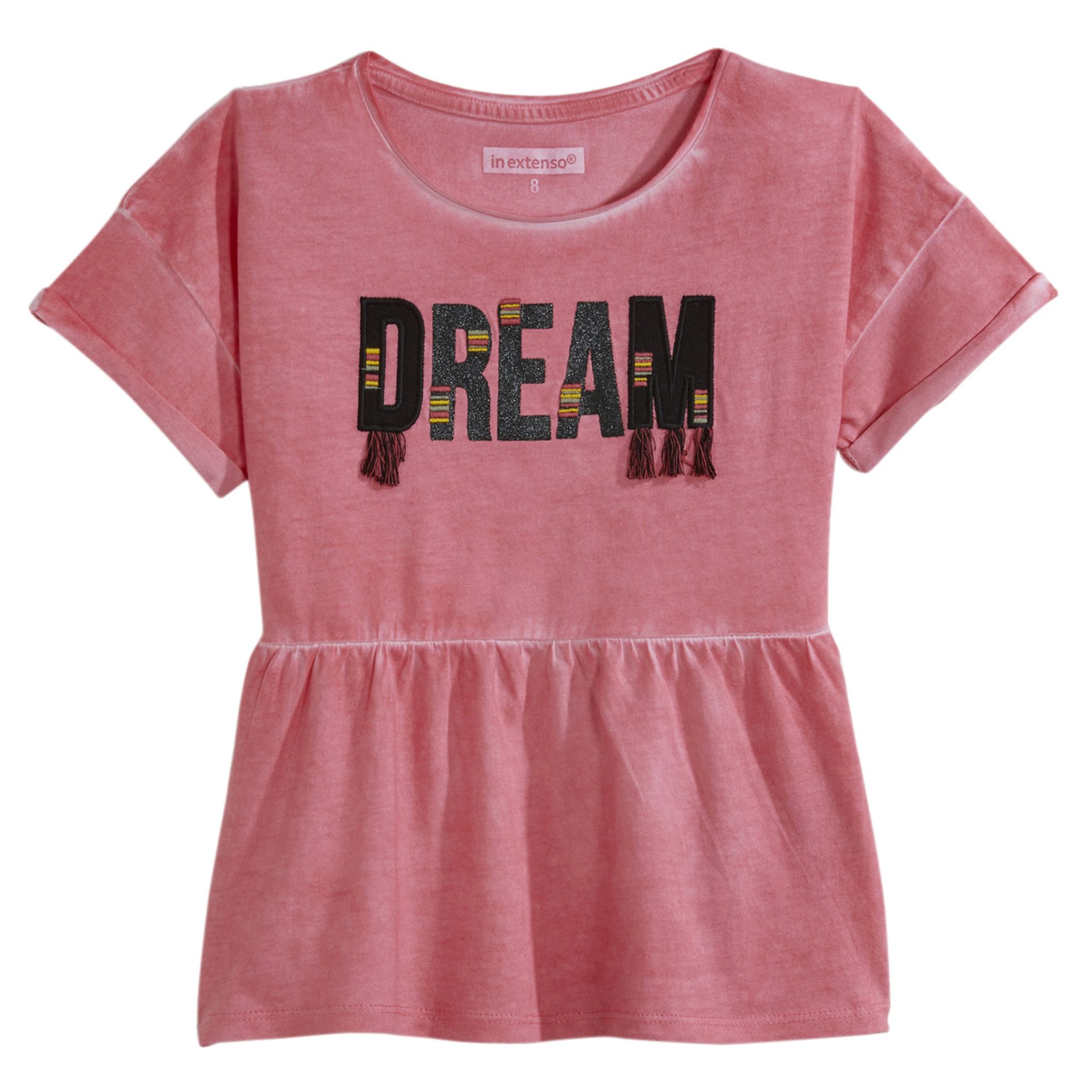 Les filles craquent pour ce tee-shirt à basque, original et plein de fantaisie. Agréable à porter. Effet délavé par endroit. 100% coton. Col rond, manches courtes à revers. Il n'y a pas d'étiquette dans le cou pour plus de douceur. Texte brodé sur le devant, avec légères paillettes et franges fa