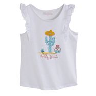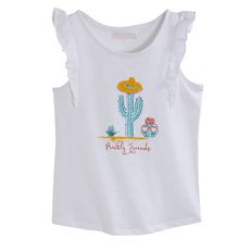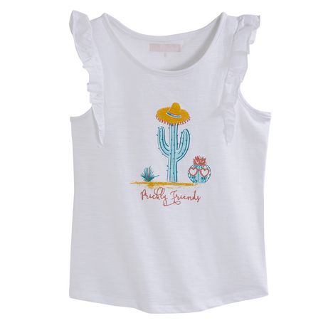 Ce débardeur fille annonce les beaux jours ! On aime : les volants fantaisie. Il est agréable à porter et doux. 100% coton. Le débardeur fille dispose d'un col rond et d'un imprimé coloré orné de légères paillettes. Il est facile d'entretien.