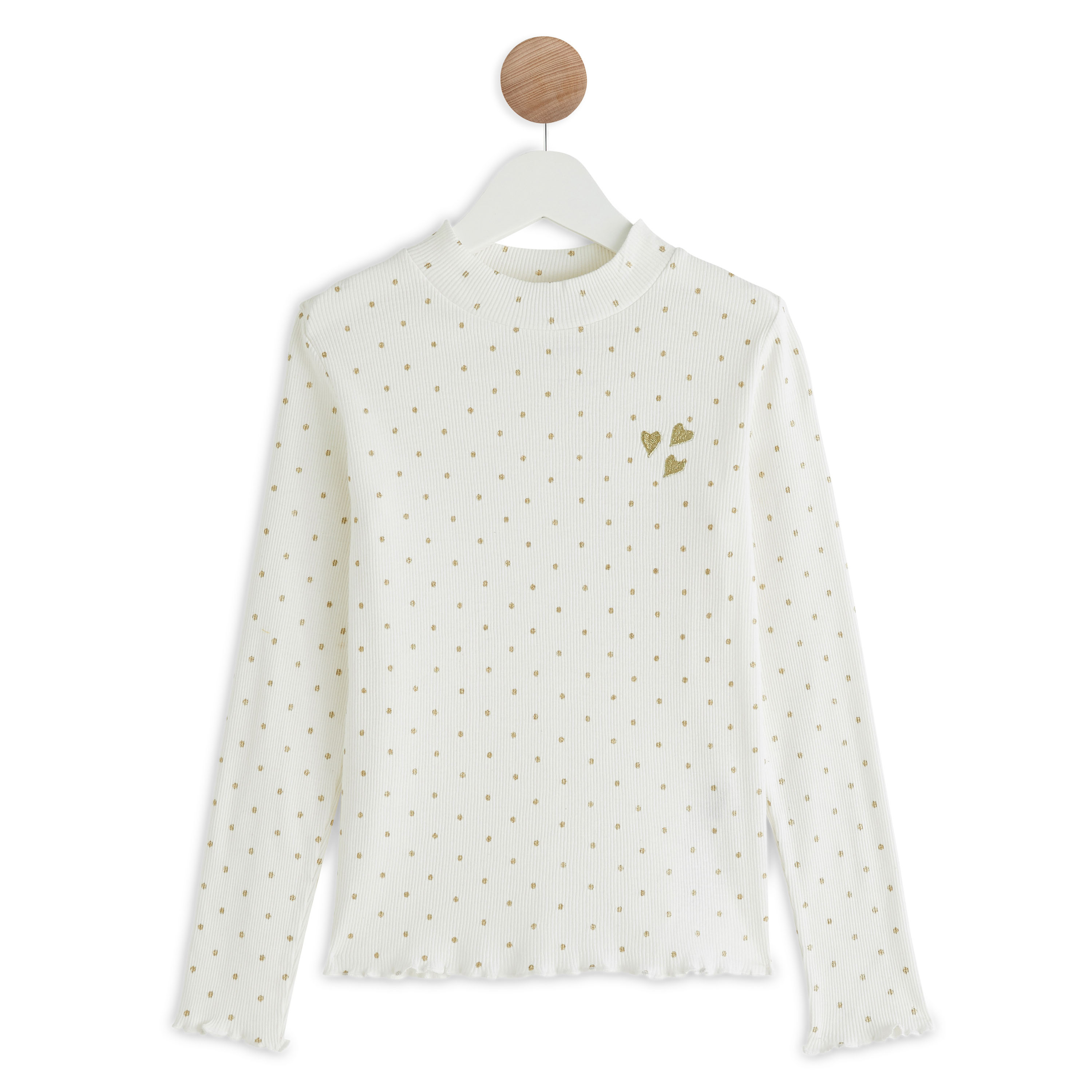 Ce tee shirt à manches longues à pois est très girly, avec sa broderie coeurs sur la poitrine ! Il se porte facilement avec un jean.