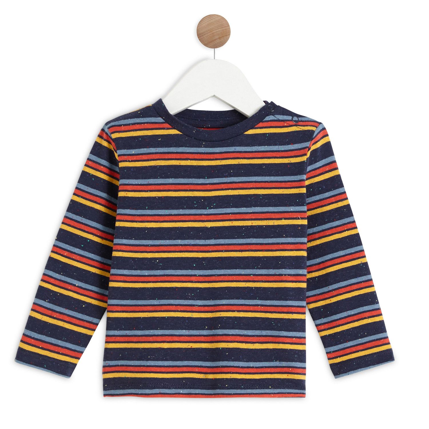 En savoir +Indispensable dans le dressing de bébé, le t-shirt à manches longues rayé s'assorti facilement à toutes les tenues ! Détail coquet sur un bon basique: ce t-shirt à manches longues est confectionné en jersey de coton parsemé de neps colorés pour un effet très frais. Confortable et pratique, ce t-shirt possède une ouverture pressionnée à l'encolure pour un enfilage facile.