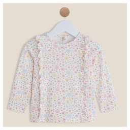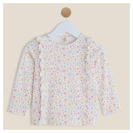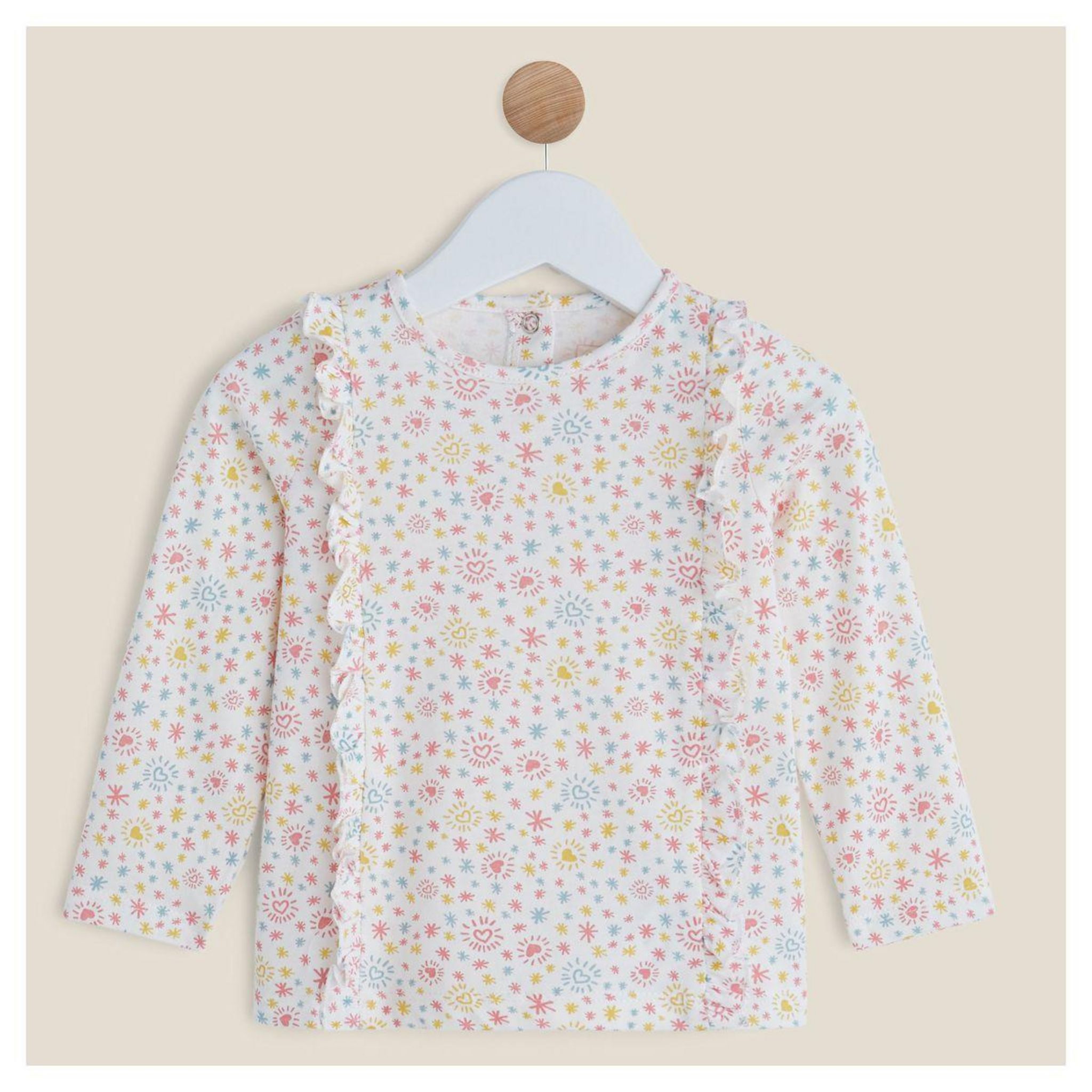 Votre petite fleur sera la plus craquante pour la belle saison avec ce T-shirt manches longues ! On adore : l?imprimé fantaisie hyper frais et les empiècements volantés sur le devant. Le T-shirt bébé fille possède une ouverture pressionnée au dos pour faciliter l?enfilage.