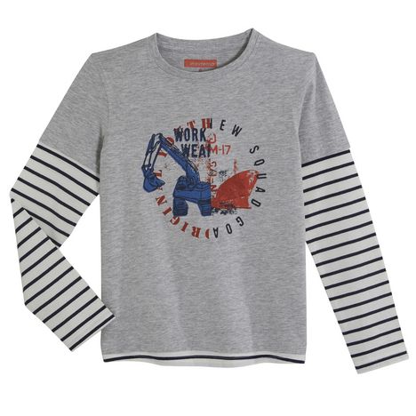 En savoir +Ce tee-shirt donne un style décontracté et original aux garçons ! On aime : l'effet 2 en 1 rayé sur les manches et à la base. Le t-shirt garçon possède un col rond, des manches longues, un imprimé sur le devant. Il n'y a pas d'étiquette dans le cou pour plus de confort.