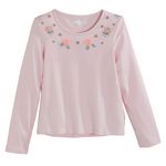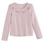 On craque pour ce tee-shirt fille à fleurs. Il est réalisé en coton. Le t-shirt possède un col rond et des manches longues, on note le jeu de découpes. Il est facile d'entretien.