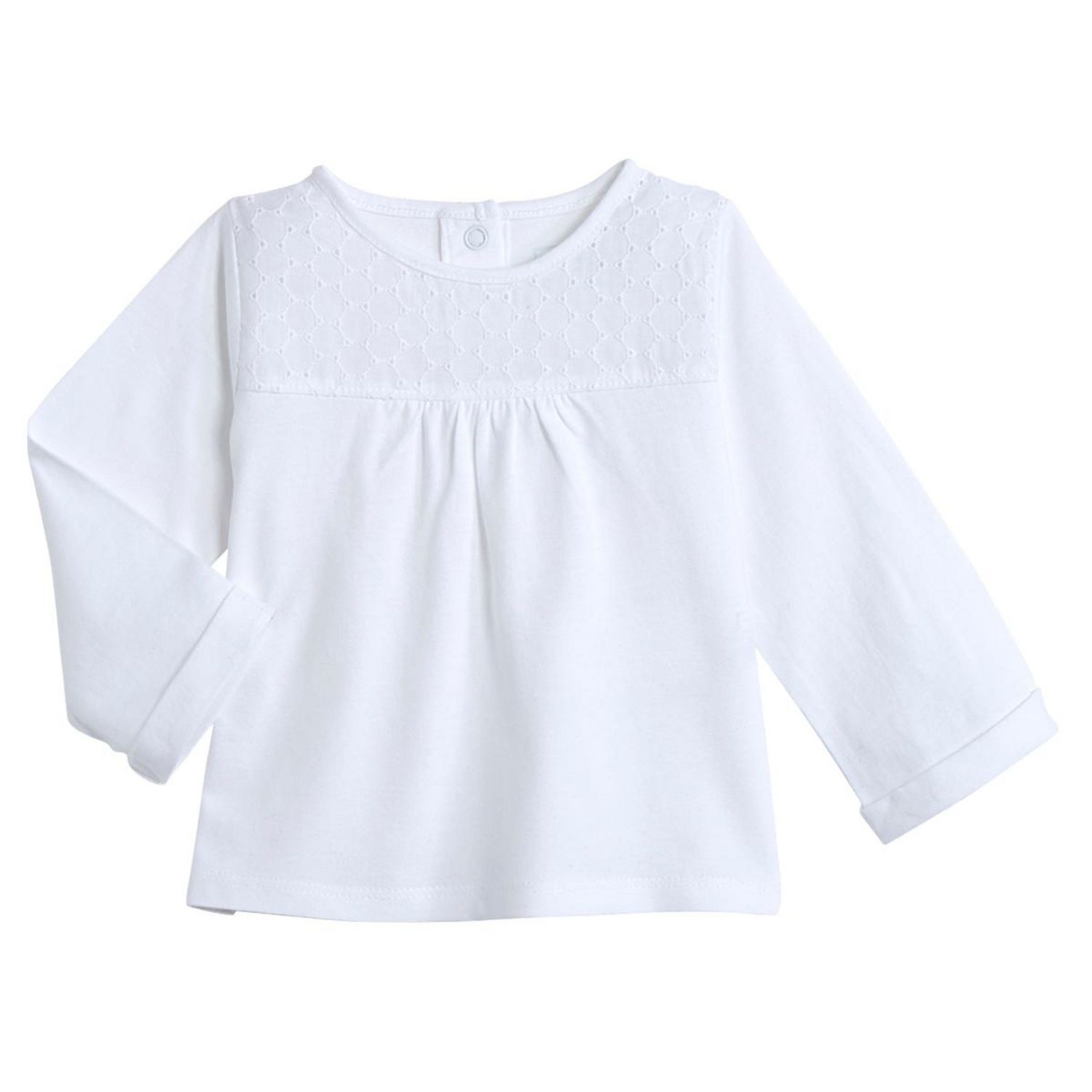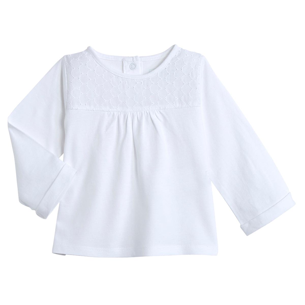 Ce tee-shirt bébé fille joue la carte de l'élégance : on l'adore ! Jersey 100% coton. Col rond, manches longues avec revers cousus. Empiècement brodé et légèrement ajouré sur le devant. Jeu de plis. Ouverture pressionnée en haut du dos. Il n'y a pas d'étiquette dans le cou pour un maximum de confor