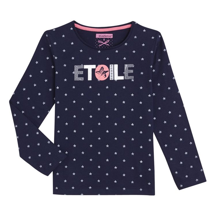 Ce tee-shirt met des étoiles dans les yeux des filles : elles l'adorent ! Jersey 100% coton agréable à porter. Col rond. Manches longues. Imprimé étoiles, avec quelques paillettes et strass fantaisie, sur le devant. Il n'y a pas d'étiquette dans le cou pour le confort. Ce t-shirt fille est lavable e