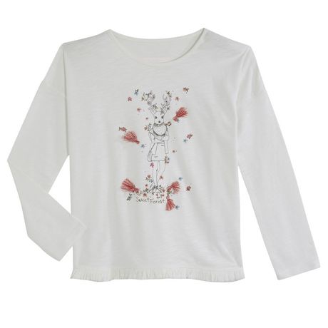 Les filles adorent ce tee-shirt fantaisie ! 100% coton. On aime l'impression et les franges fantaisie sur le devant et à la base. Col rond, manches longues. Il n'y a pas d'étiquette dans le cou pour le confort. Ce t-shirt fille est facile d'entretien.