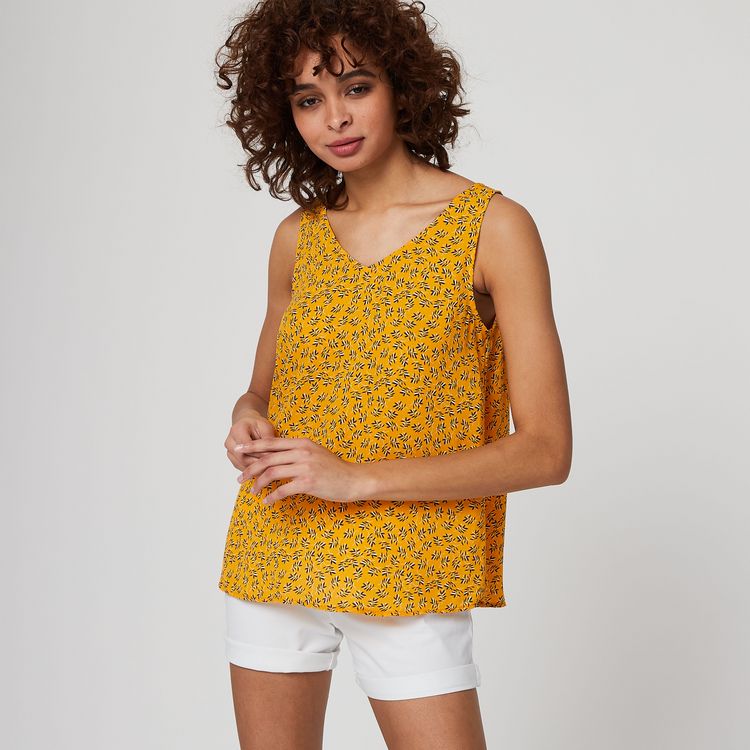Tout en légèreté, ce top imprimé col v vous séduira avec ses croisillons dans le dos.