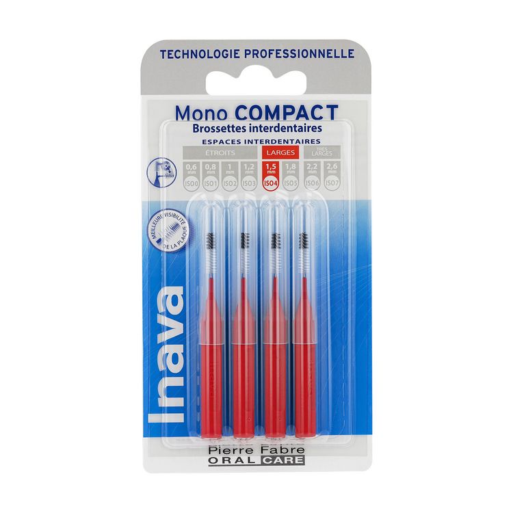 Les Brossettes Interdentaires Inava Monocompact contribuent à un nettoyage interdentaire efficace et complètent les gestes d’hygiène bucco-dentaire quotidiens. Leur usage est particulièrement recommandé aux personnes porteuses d’implants, d’appareils orthodontiques ou dont les collets dentaires sont dénudés. Leur utilisation permet de réduire la formation de la plaque dentaire, responsable de caries et de gingivites. Les brins noirs de la brossette, en contraste avec la blancheur des dents, en facilitent l’insertion et permettent d’observer les dépôts ôtés. Les brins blancs, quant à eux, signalent les saignements occasionnels. Elles se rincent et se rangent après usage et peuvent être réutilisées. Afin de bien choisir la taille de la brossette, la gamme est composée de 8 références allant de la plus fine (ISO 0) à la plus large (ISO 7), reconnaissables à leurs différentes couleurs et proposées par paquet de 4.