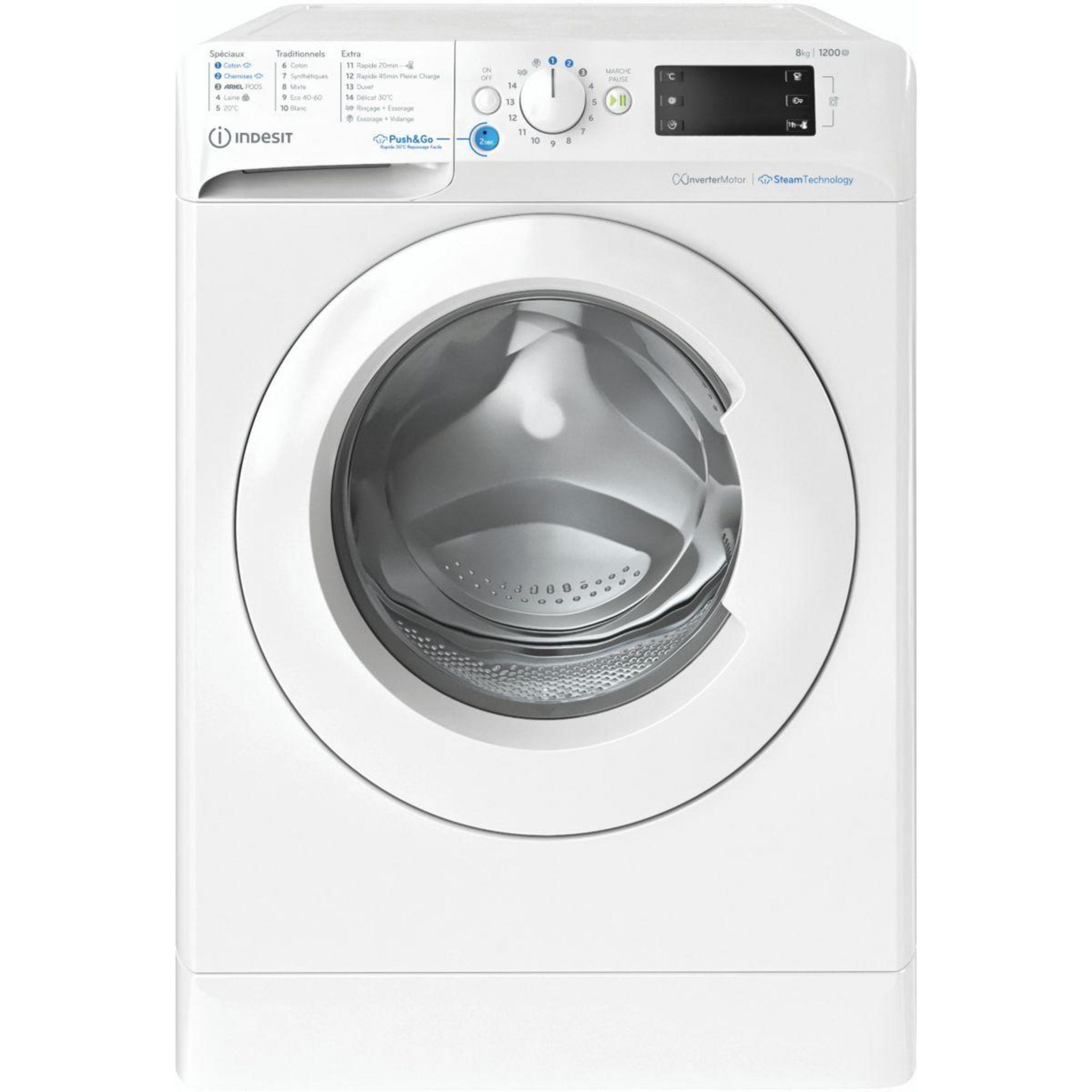 | Push&Go Steam Technology | sans programmer votre machine, activez un cycle de lavage quotidien de moins d'une heure avec le pouvoir de la vapeur grâce à un seul bouton. Dans les 15 dernières minutes du cycle, de la vapeur est injectée dans le tambour pour assouplir les tissus | |