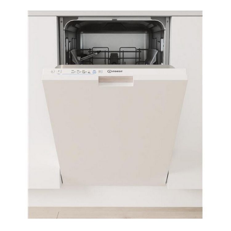 Lave-vaisselle Tout intégrable Indesit IN2IKE107 largeur 45 cm. Compact mais performant, ce modèle est conçu pour s'adapter aux petits espaces tout en garantissant une efficacité optimale au quotidien. Il propose 5 programmes dont l'éco 50°C pour une consommation maîtrisée, le Push&Go 50°C qui lance un cycle de lavage + séchage en 85 minutes en un seul geste, et un programme intensif à 65°C pour la vaisselle très sale. Un rapide 40 minutes à 45°C complète l'offre pour les besoins express. Le moteur Inverter assure un fonctionnement silencieux (47 dB), durable et économe. Le panier supérieur est réglable en hauteur et intègre un balconnet escamotable pour maximiser l'espace. Le panier à couverts est nomade pour un chargement et un déchargement facilités. La cuve en inox garantit robustesse et hygiène dans le temps. Une sécurité anti-débordement protège l'appareil en cas d'anomalie. Il est livré sans habillage ni porte décorative, afin de vous permettre de l'assortir au mobilier et à la couleur de votre cuisine.