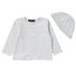 Idéal pour les tout premiers jours de bébé, cet ensemble 4 pièces en jersey tout doux se compose d'un body manches longues avec ouverture pressionnée croisée sur le devant, d'une combinaison à pieds à l'imprimé poétique et délicat avec bretelles pressionnées, d'un gilet gris clair en molleton doublé de pointelle avec ouverture pressionnée et d'un bonnet assorti.