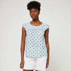 En savoir +Pièce estivale par excellence, cette blouse, en viscose, s’impose comme le nouvel indispensable de la saison que l’on aime porter avec un denim, un bermuda ou une jupe. Ce petit haut multiplie les détails en affichant une encolure ronde, une découpe sous poitrine avec un jeu de petits plis, des manches courtes volantées et un imprimé tendance.