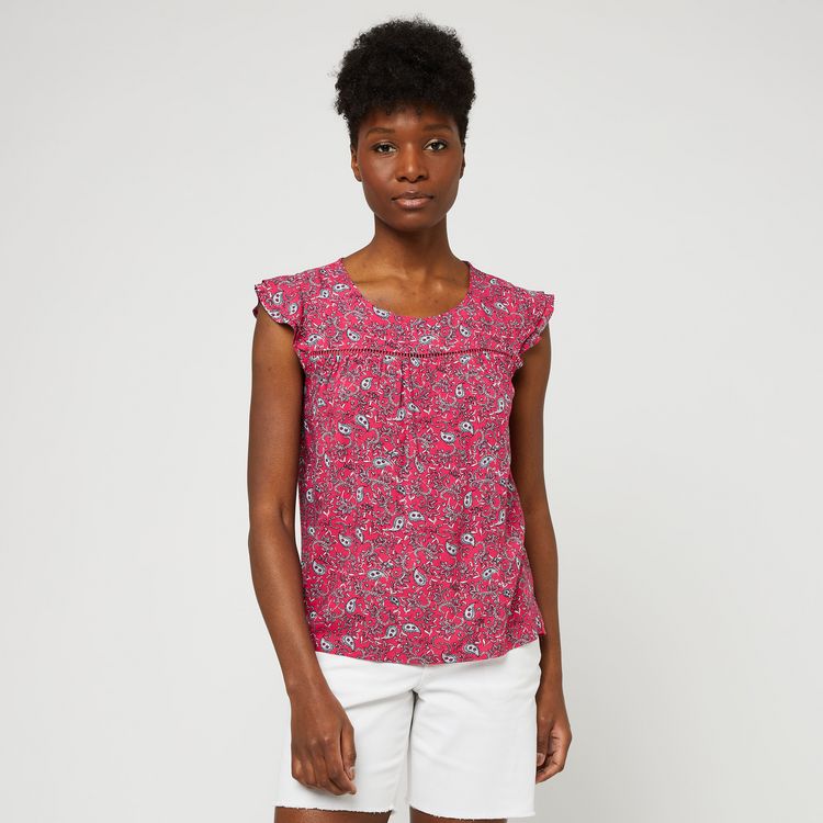 En savoir +Pièce estivale par excellence, cette blouse, en viscose, s’impose comme le nouvel indispensable de la saison que l’on aime porter avec un denim, un bermuda ou une jupe. Ce petit haut multiplie les détails en affichant une encolure ronde, une découpe sous poitrine avec un jeu de petits plis, des manches courtes volantées et un imprimé tendance.