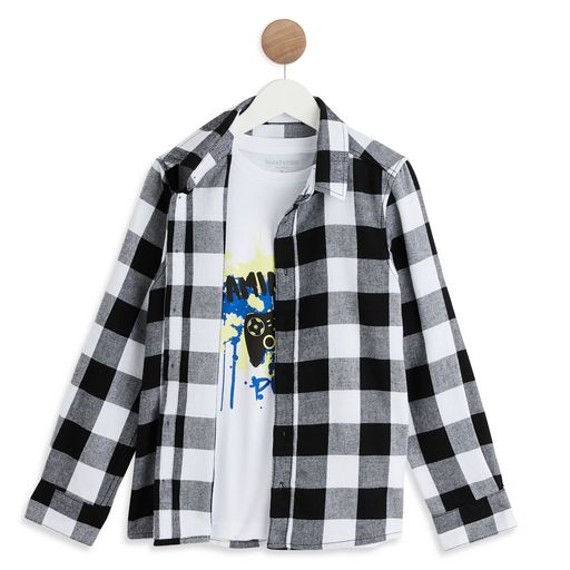 En savoir +Composé d’une chemise à carreaux à manches longues en flanelle et d’un t-shirt à manches courtes avec un motif placé devant, ce duo en coton, aux couleurs assorties joue les détails pour un look casual. On le porte sans hésiter sur son jean préféré pour plus de style et l’on choisit de porter chaque élément seul ou en ensemble pour multiplier les styles !