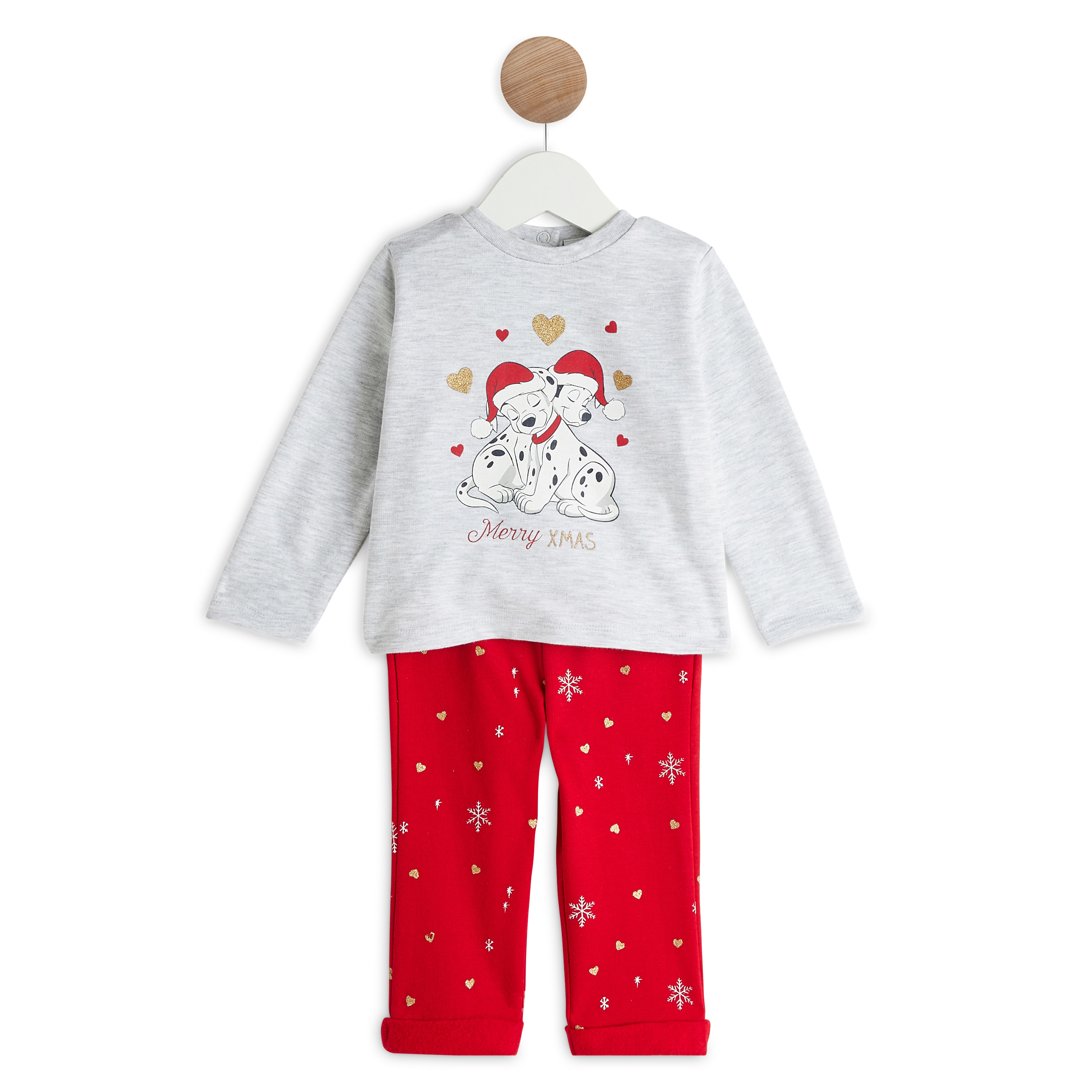 On craque pour la tendresse de cet ensemble 2 pièces en molleton bien douillet ! On aime l'imprimé 101 Dalmatiens devant sous le thème de Noël. Le haut à manches longues possède une ouverture pressionnée sur l'épaule. Le pantalon présente une taille élastiquée et des revers cousus.