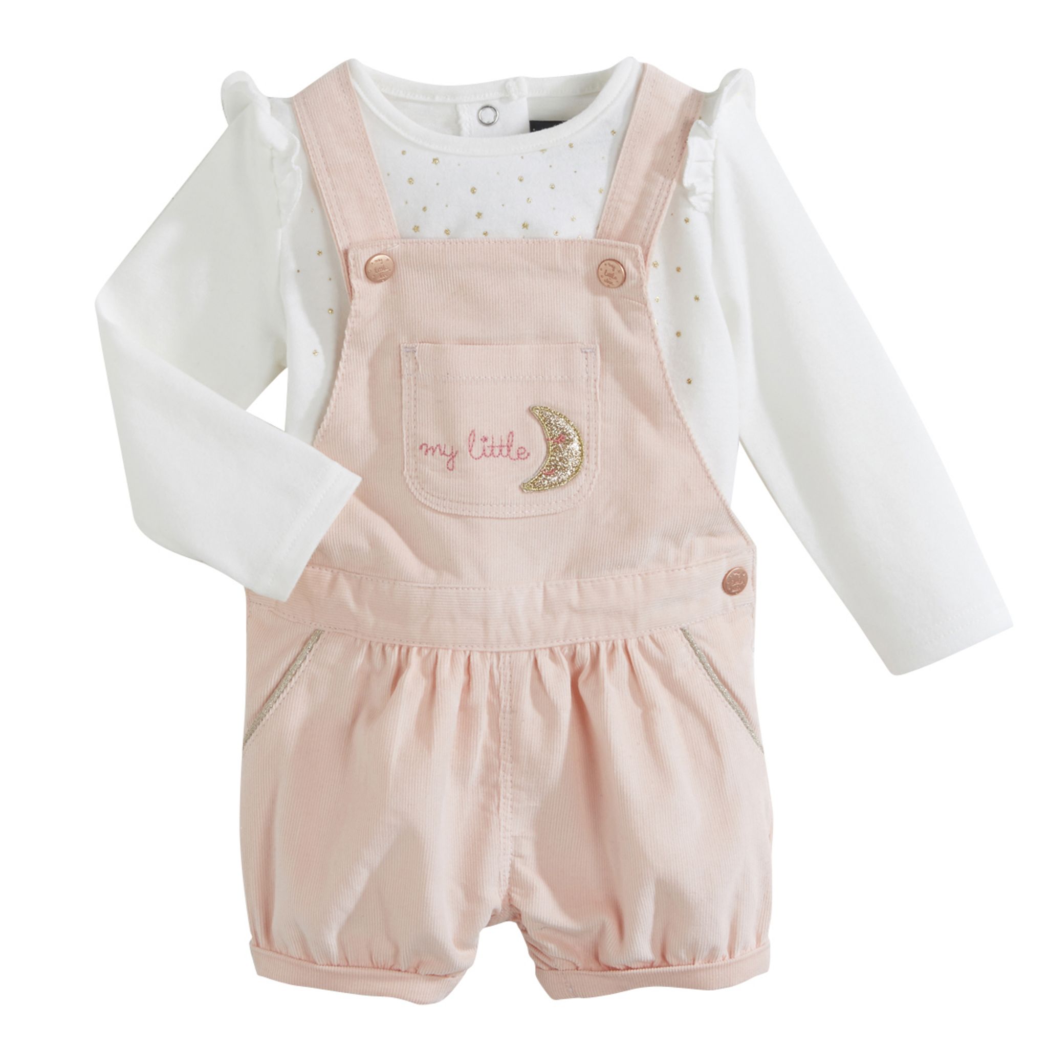 On craque pour cet ensemble bébé fille composé d'une salopette courte en velours fin et d'un top à étoiles dorées sur le devant. Salopette bébé : fermeture par boutons pression aux bretelles, côtés et entrejambe ; fausses poches à passepoil brillant ; poche sur la bavette avec patch lune doré ; petites fronces sous la ceinture. Tee-shirt bébé fille : manches longues ; col rond ; petits volants aux épaules ; ouverture par 3 pressions au dos. 100% coton