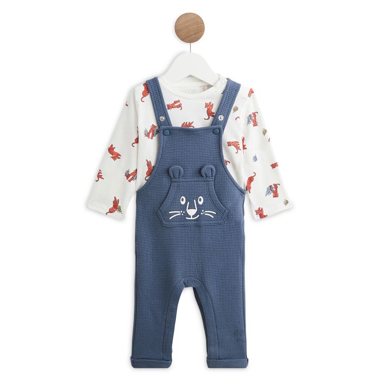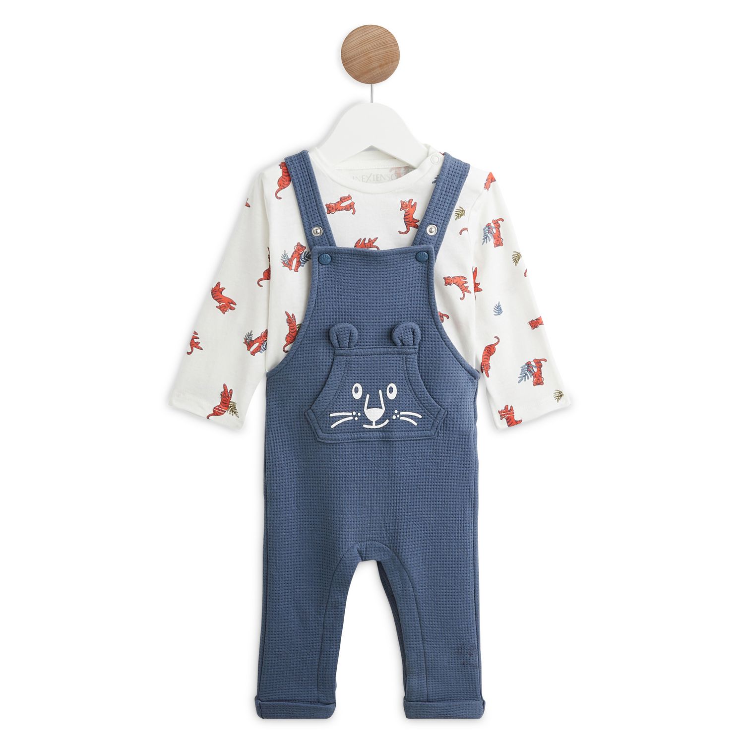 Bébé sera trop mignon avec cet ensemble salopette et tee shirt manches longues. La salopette arbore un superbe tigre sur le devant. Elle se ferme grâce à deux boutons à l'avant. Bébé sera trop stylé avec cet ensemble.