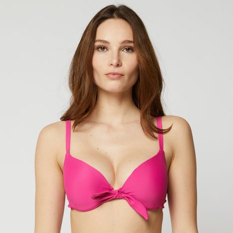 En savoir +Ce maillot de bain à la coupe corbeille met en valeur le decolleté et permet de multiplier les compositions avec toutes sortes de bas afin de créer votre ensemble idéal. Pour plus de confort, les bretelles sont réglables et la fermeture par agrafe permet un meilleur ajustement. On aime son coloris uni et le petit noeud entre la poitrine.